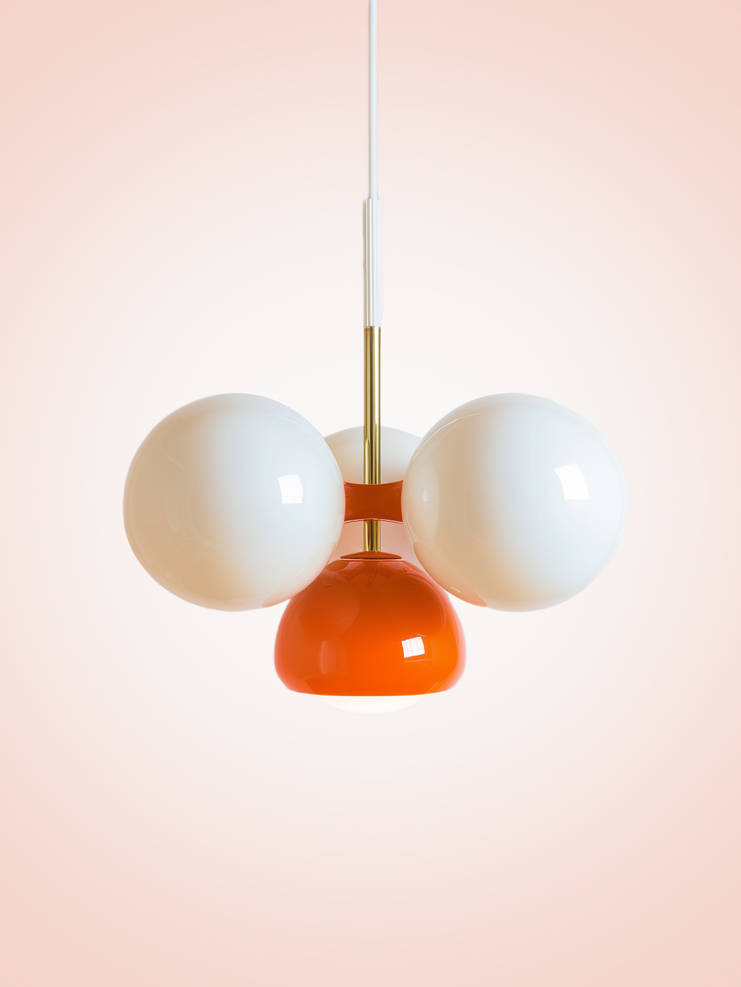 DESIGN FEATURES The Glimmer chandelier features a multi-tiered structure with a sleek white central column, accented by vibrant orange circular rings that add a pop of color and depth. The soft, frosted bulb at the base emits a gentle, diffused light, enhanced by the layered design that creates a subtle, shimmering effect. The smooth, glossy finish and minimalist suspension rod contribute to its elegant yet playful aesthetic.
